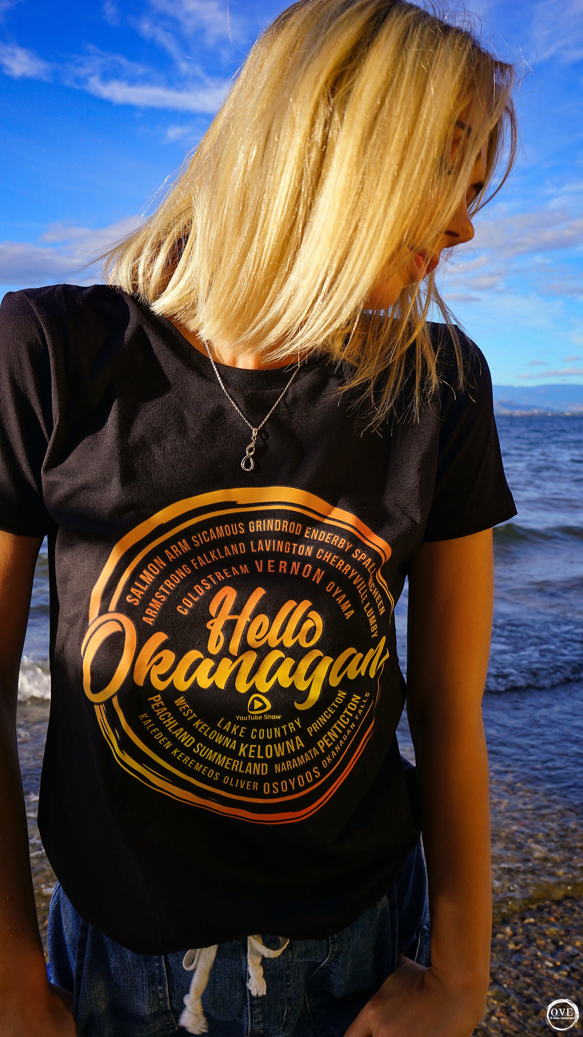 Hello Okanagan Towns Sunset Fitted Black Ladies T-shirt